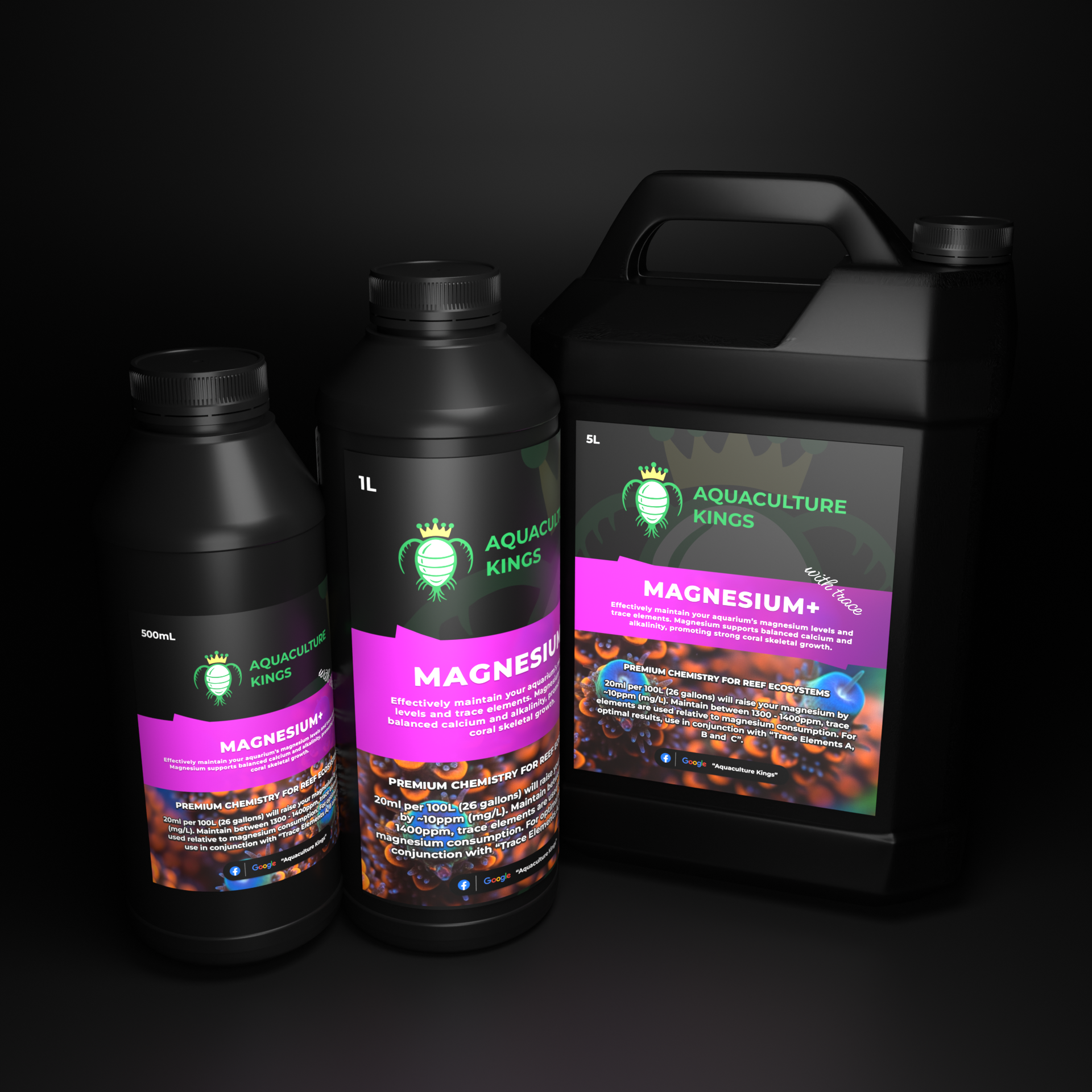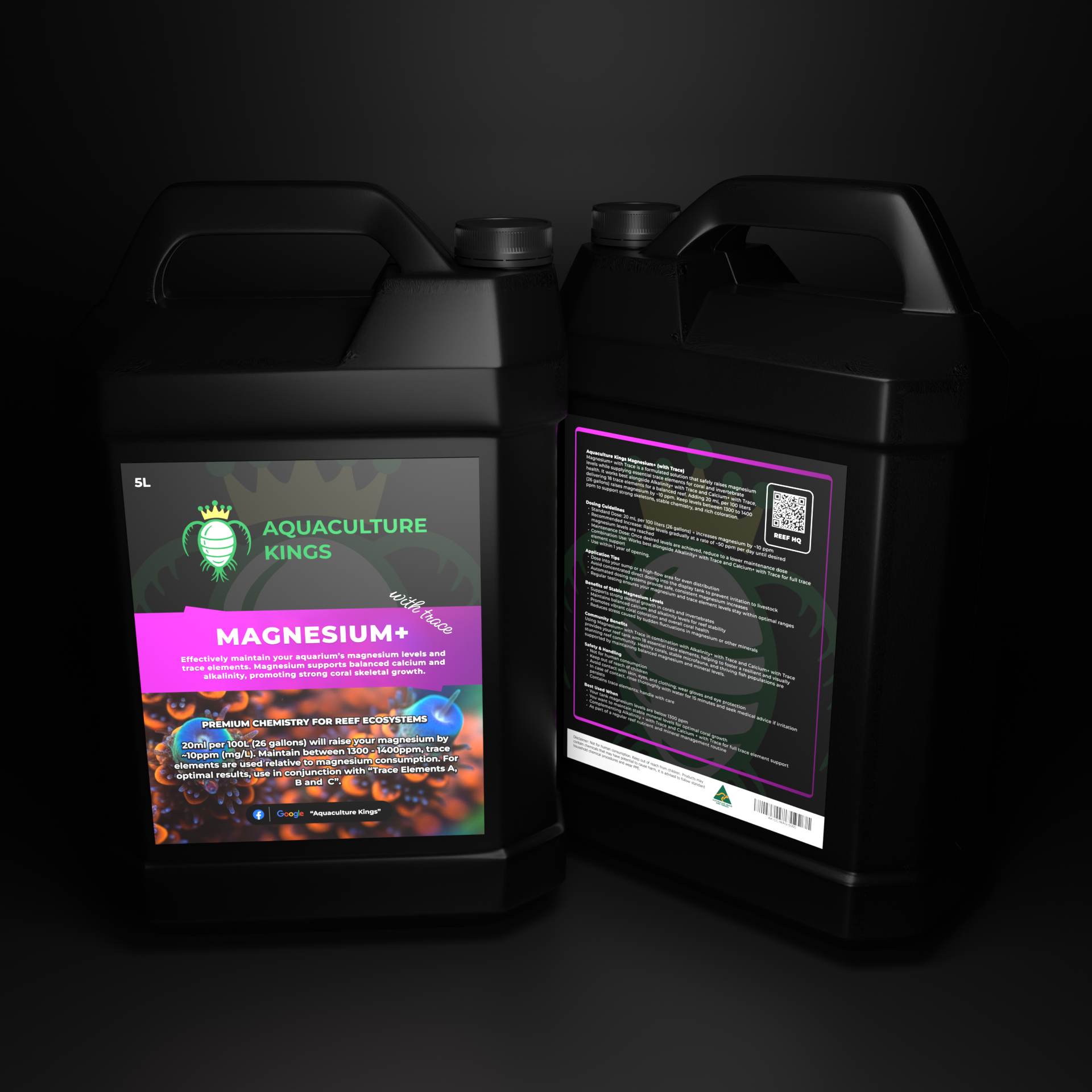 When added, 20 mL per 100 liters (26 gallons) will increase magnesium by approximately 10 ppm. Maintaining stable magnesium levels between 1300–1400 ppm helps corals build strong skeletons, supports healthy reef chemistry, and promotes vibrant coloration.